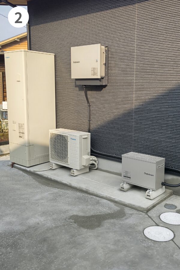 ②【ダイキンエコキュート】 横の壁にはニチコン社製蓄電池のパワーコンディショナー設置 ヒートポンプの横に設置しているのが蓄電池