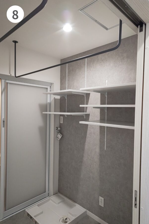 ⑧【脱衣室壁には稼働棚】 天井にはアイアンポールを設置